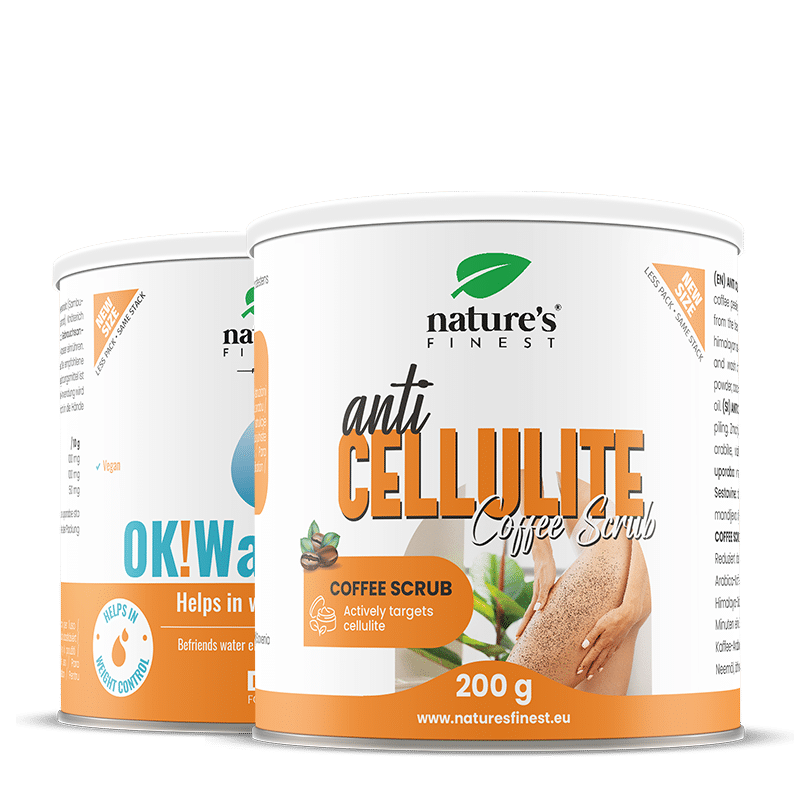 Anti Cellulite Coffee Scrub: Malda rostade arabica kaffebönor*, rosa Himalayasalt, extra jungfru kokosnötsolja*, kallpressad mandelolja, oraffinerad neemolja, neemblad, vitamin E. OK!WaterOut: Maltodextrin, bambufiber, naturlig ananasarom, nässelrotextrakt, fläderbärsextrakt, sötningsmedel: steviolglykosid.