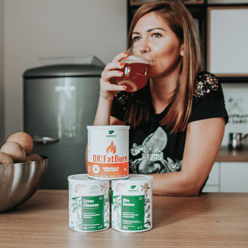 På kvällen före middagen rör i 1 skopa (5 g) OK!FATBURN drink i ett glas vatten, och efter middagen rör 1 tesked LIVER CLEANSE i ett glas vatten för att stimulera leverreningen över natten.