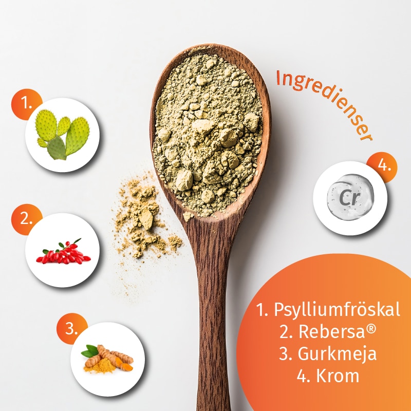 Ingredienser: inulinpulver, extrakt av fikonkaktusstam (nopal) 10:1 (Opuntia ficus-indica), mangosmak, citronsmak, extrakt av läkevänderot (Valeriana officinalis, rot), stabiliseringsmedel: cellulosa, Rebersa® Hydrochloride (extrakt av Berberis aristata) varav 97 % berberinklorid, extrakt av gurkmeja (Curcuma longa, rot), kanelpulver (Cinnamomum zeylanicum, bark), sötningsmedel: steviolglykosider från stevia, krompikolinat. Innehåller naturligt förekommande sockerarter.