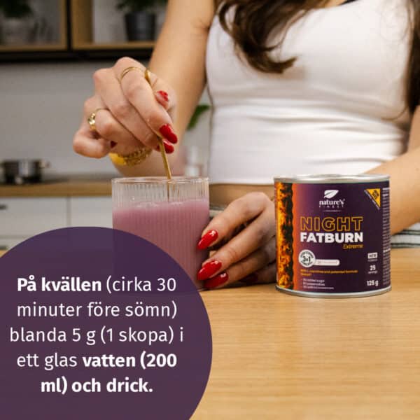På kvällen (cirka 30 minuter före sömn) blanda 5 g (1 skopa) i ett glas vatten (200 ml) och drick.