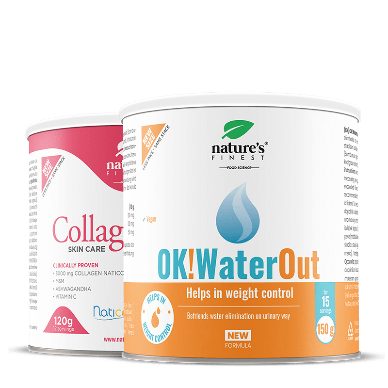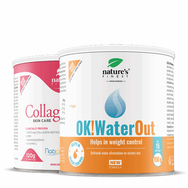 För de första 15 dagarna, blanda 2 skopor (10 g) av OK!WaterOut ananassmakande dryck i ett glas vatten på morgonen. Sedan, för de kommande 12 dagarna, blanda 2 skopor (10 g) SkinCare Collagen i ett glas vatten på eftermiddagen eller kvällen, låt kollagenet lösas upp helt i två minuter och drick. Drycken har en god jordgubbssmak. Med 20 g pulver konsumerar du 5 g Naticol-kollagenpeptider.