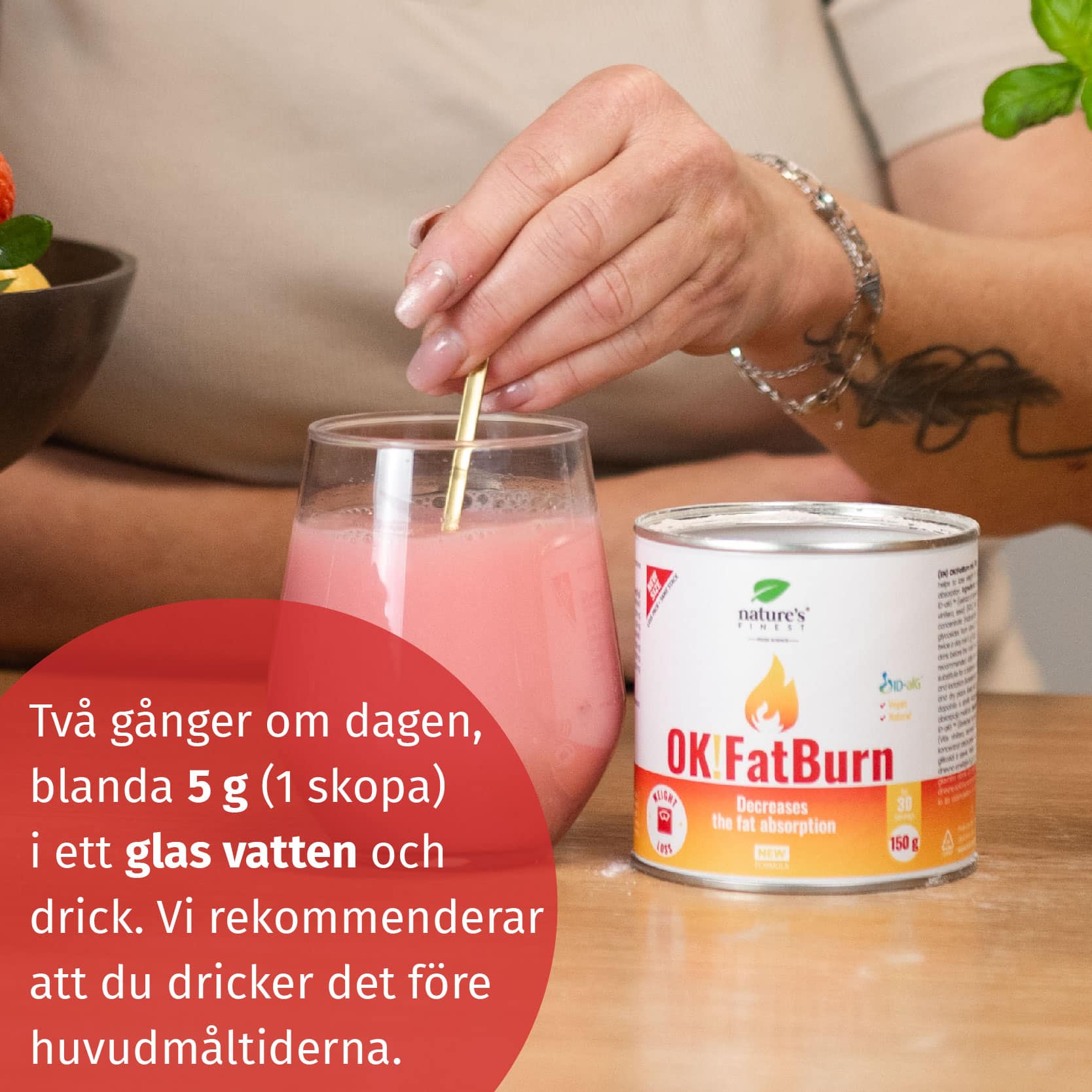 Blanda 5 g (1 skopa) i ett glas vatten två gånger dagligen och drick upp. Vi rekommenderar att drycken intas före huvudmåltiderna. För exakt dosering rekommenderas vägning.