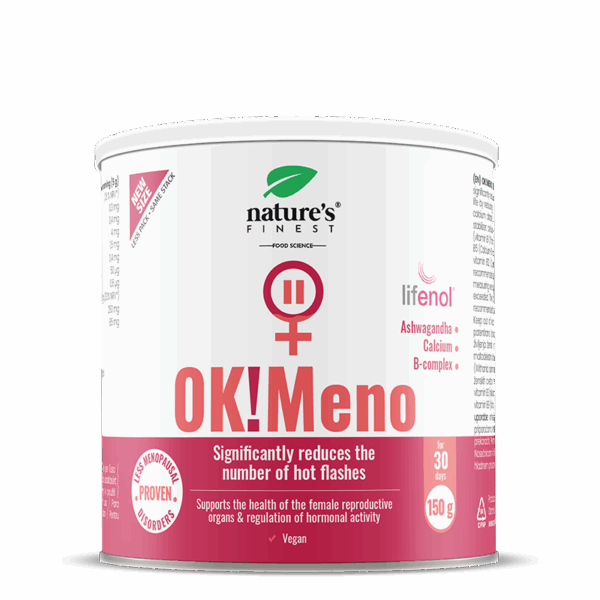 OK!Meno innehåller det patenterade växtextraktet Lifenol®, som förbättrar livskvaliteten hos kvinnor i klimakteriet inom 6 veckor genom att avsevärt minska frekvensen av värmevallningar och nattliga svettningar¹*. I kombination med ashwagandha, som stödjer mentalt och nervöst balans samt oro², ger det ett heltäckande stöd.