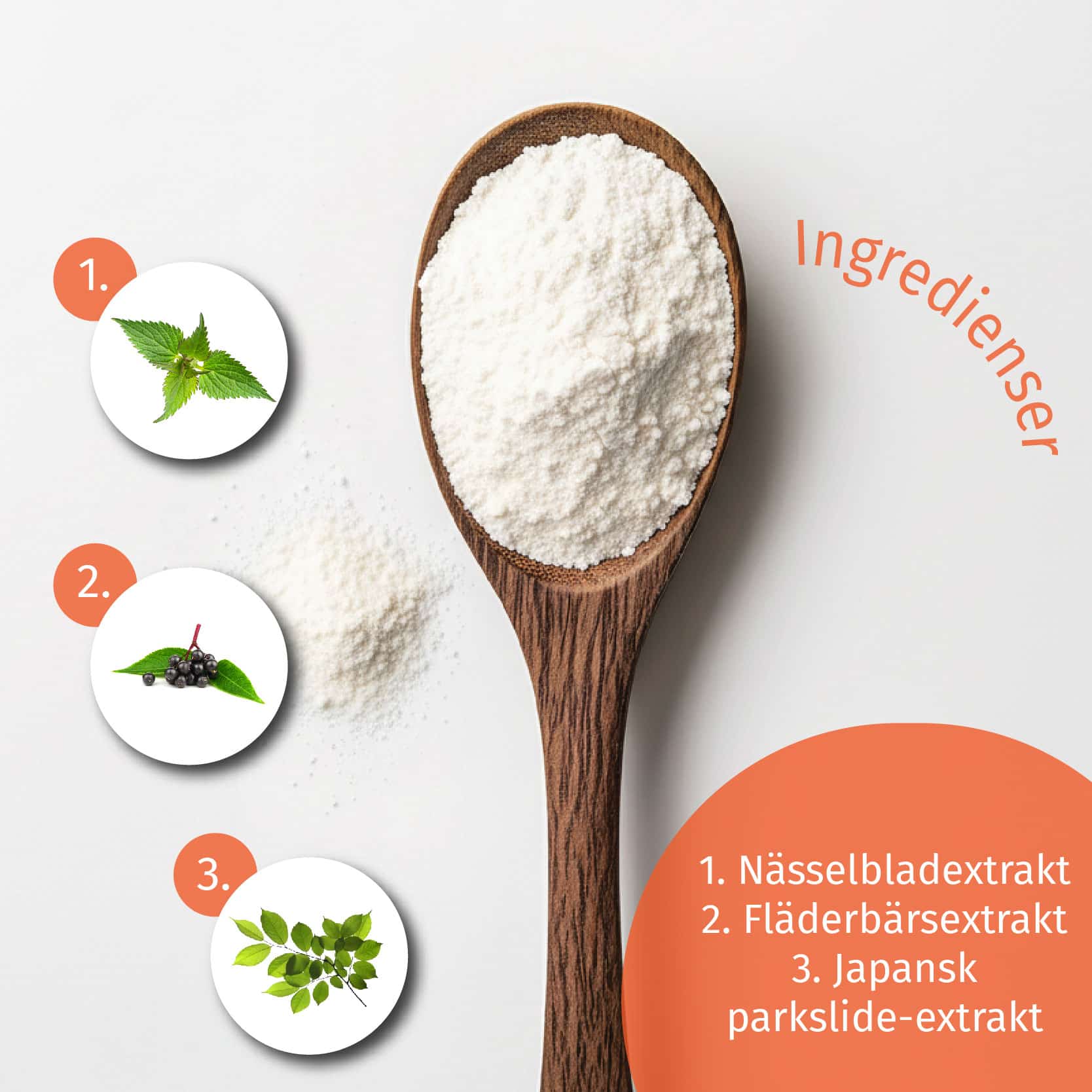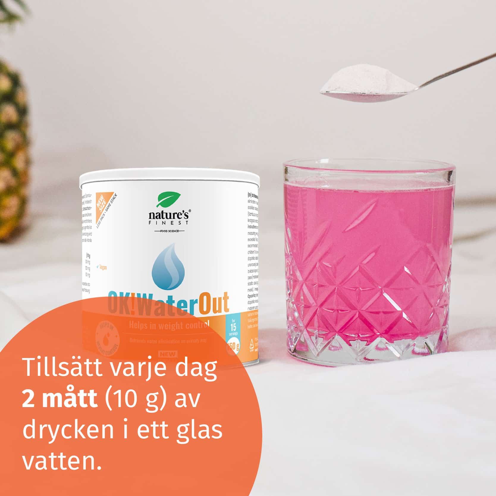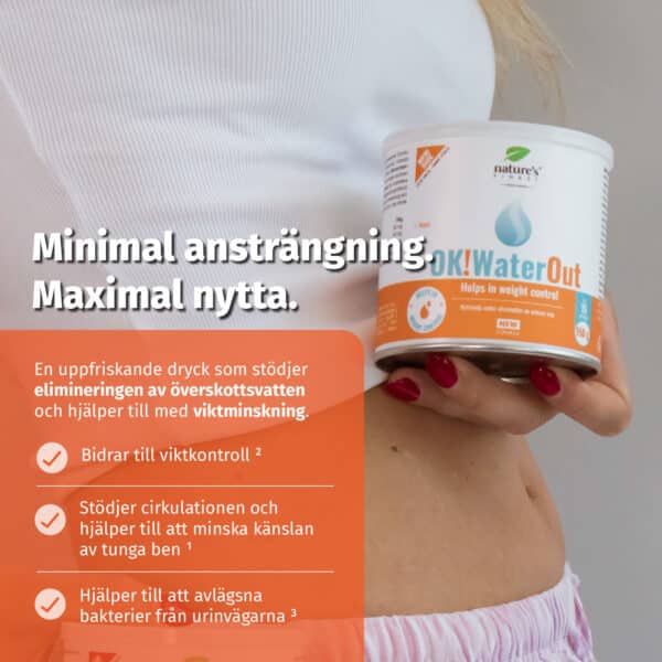 Varje dag doserar du 2 mått (10 g) OK!WaterOut-dryck i ett glas vatten. Med ett mått får du i dig 100 mg nässelextrakt, 100 mg fläderextrakt och 50 mg trampörtextrakt.